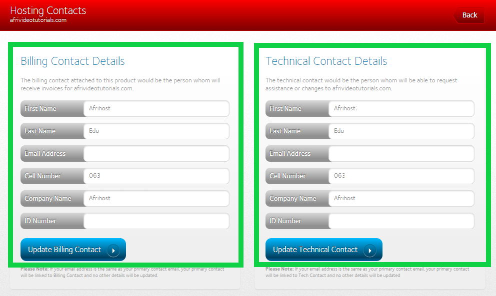 If your email address is the same as your primary contact email, your primary contact will be linked to Billing/Technical Contact and no other details will be updated.
