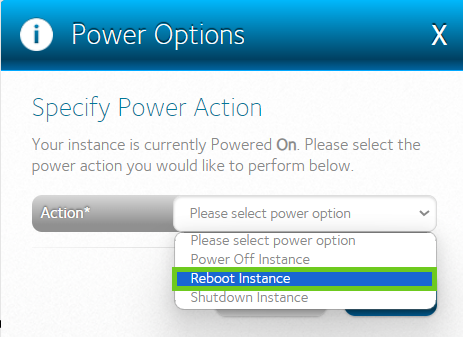 - Select ‘Reboot Instance’ to perform a reboot on the server.