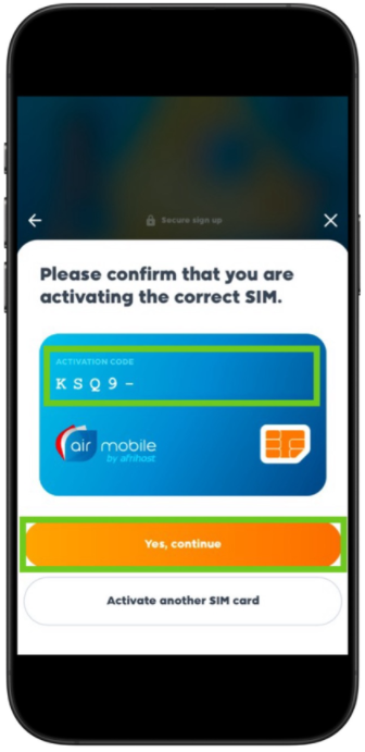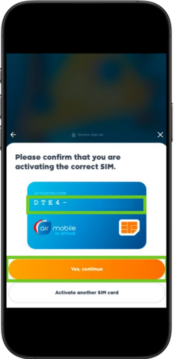 - An activation page will appear, confirm that you're activating the correct sim via ‘Activation code’ under the QR code.