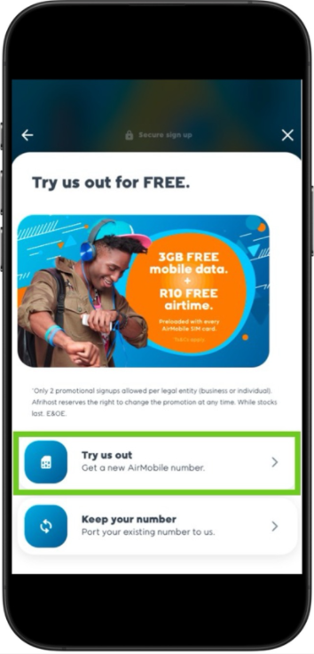 - Select ‘Try us out’ to sign up for a new AirMobile number.