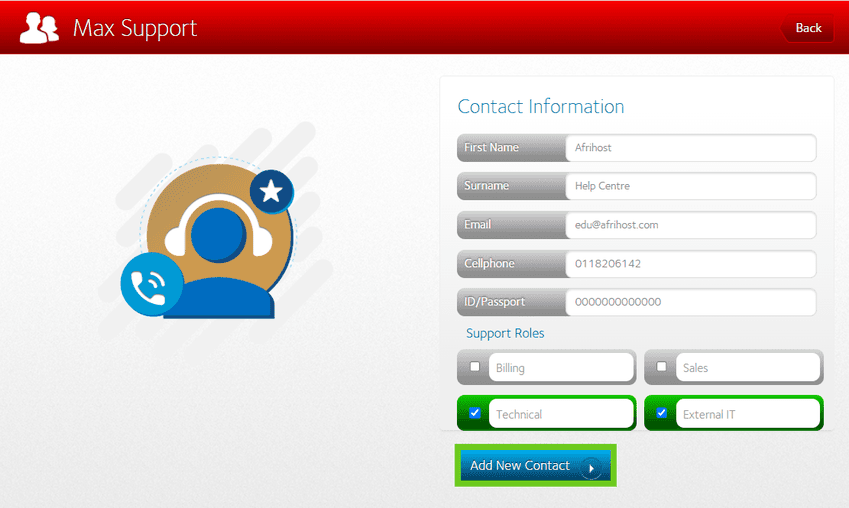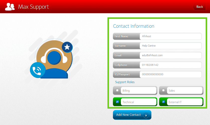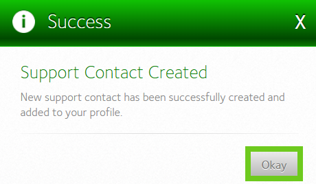 - A success message will appear once support contact has been created. Click ‘Okay’ to save the details.
