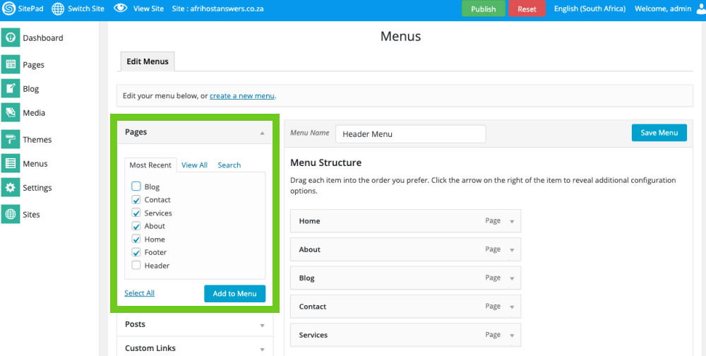 - Select ‘Afrihost Site Builder’ in cPanel or select ‘Sitepad’ in your CWP control panel.