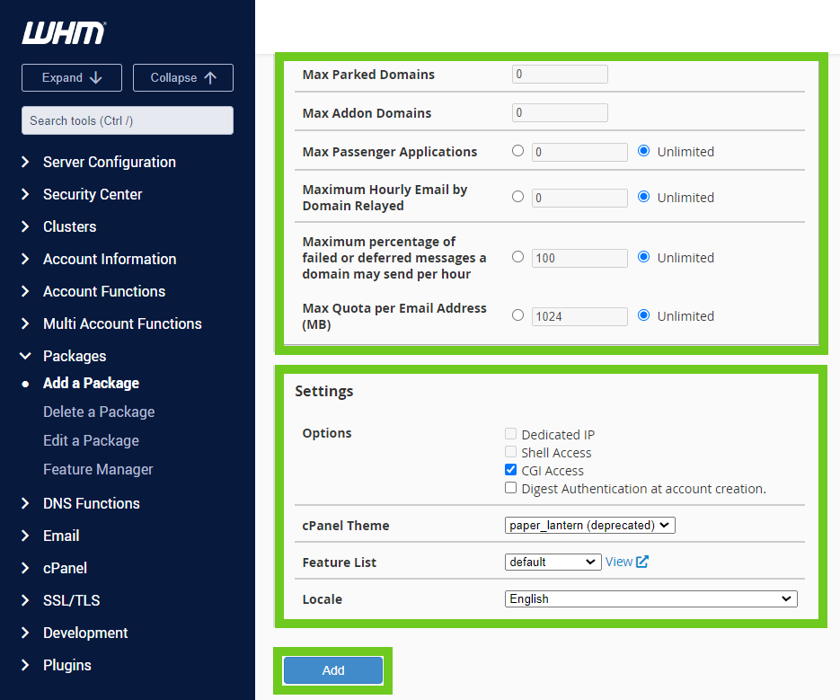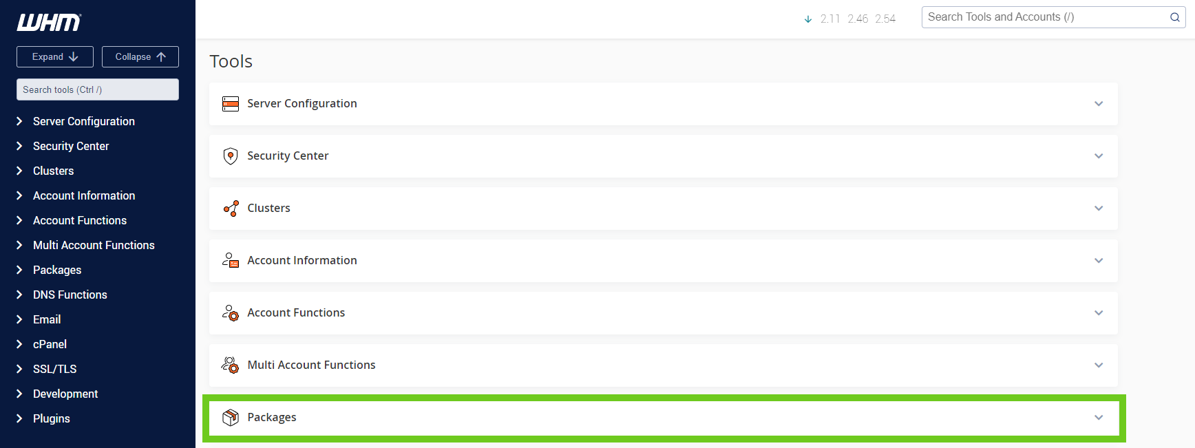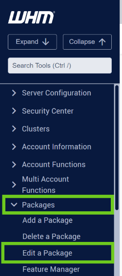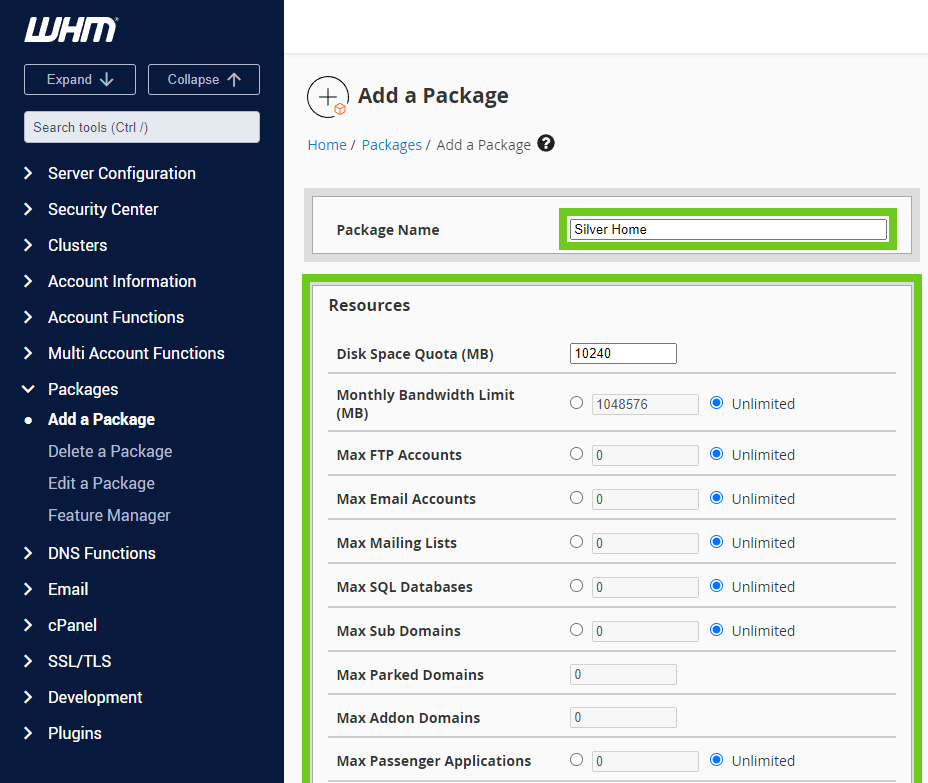 WHM is the platform that allows you to create custom hosting plans or packages that you can assign to an account. Each package can be customized to assign specific resources, quotas and features to each package and scale according to your client’s requirements.