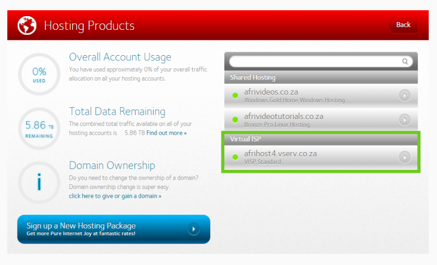 - Select the VISP (virtual ISP) account from the list of Hosting products on the right-hand side.