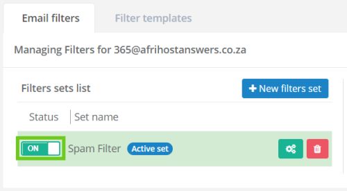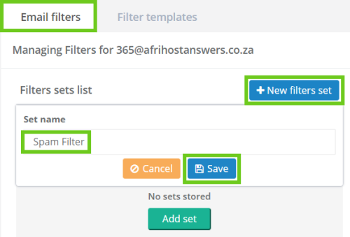 - Select the ‘+ New filters set’ button and enter the name of the filter you have created and wish to assign to the email address.