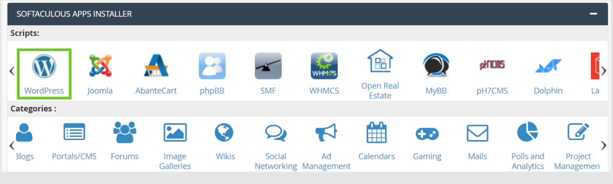 - Under ‘Softaculous App installer', select ‘WordPress’.