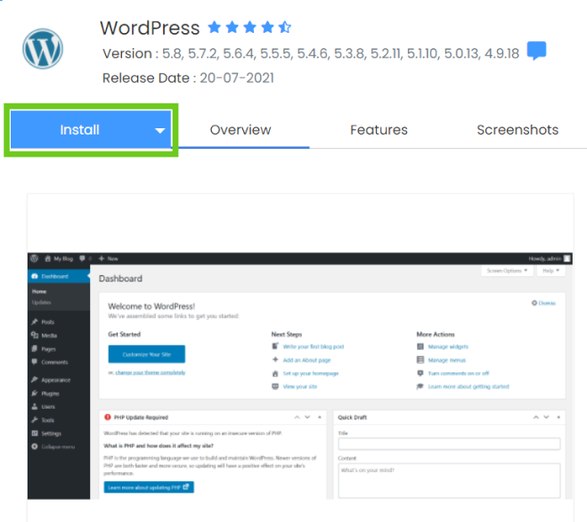 - The WordPress page will open, click ‘Install’ at the top of the page.