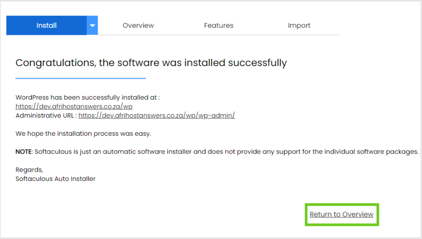 Congratulations, you have successfully installed WordPress using Softaculous.