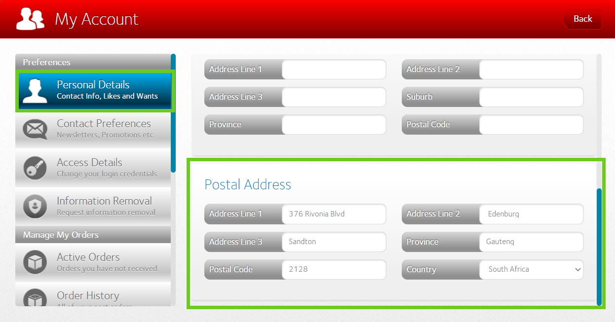 - Scroll down and enter your physical address details under the ’Postal Address’ section.