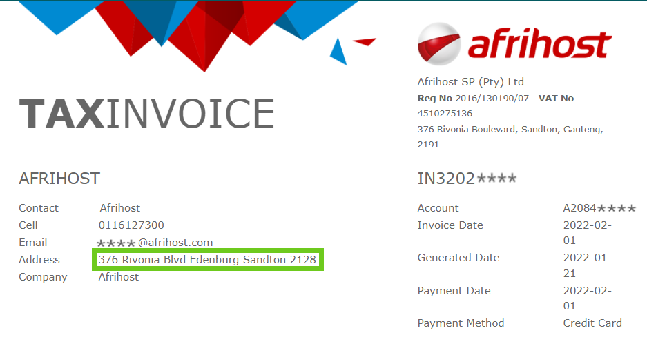 - Your new details will now display on your Afrihost invoices next to ‘Address’.