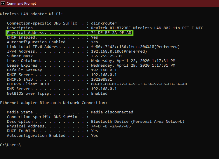 - In the details provided, you will see a physical address similar to this: G8-2B-72-EF-D6-8D