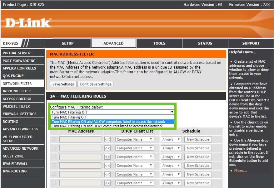 “Turn MAC Filtering ON and DENY computers listed to access the network”.