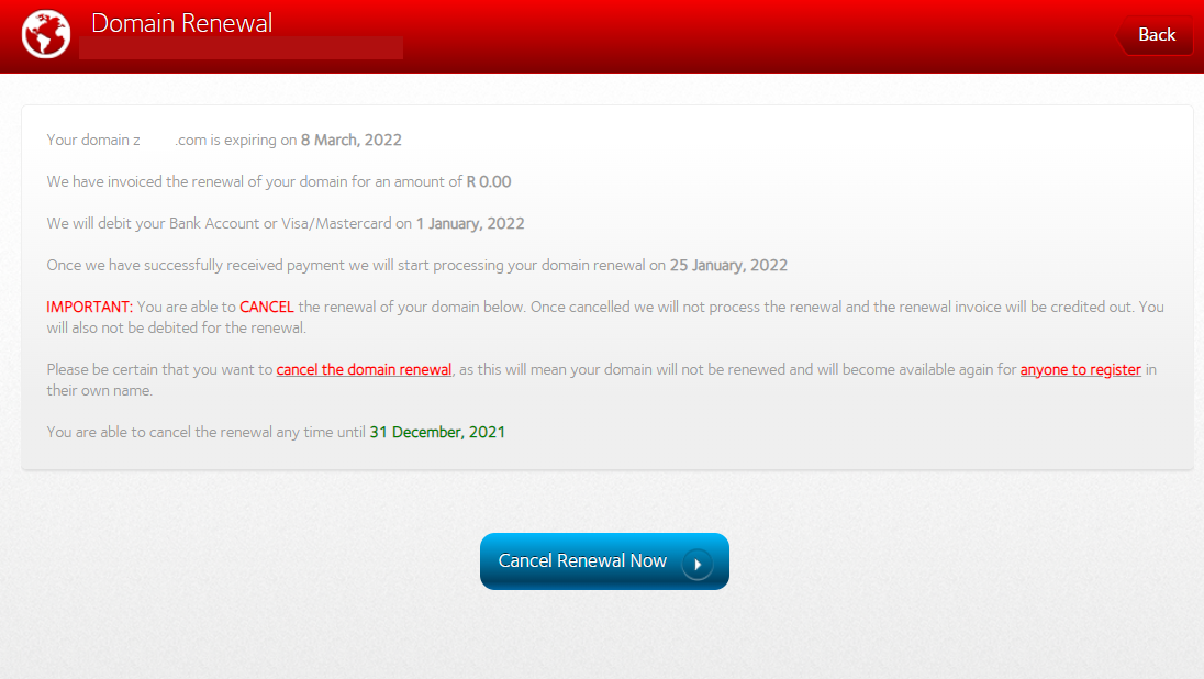 - If you wish to go ahead with the cancelation, click on the ‘Cancel Renewal Now’ button.