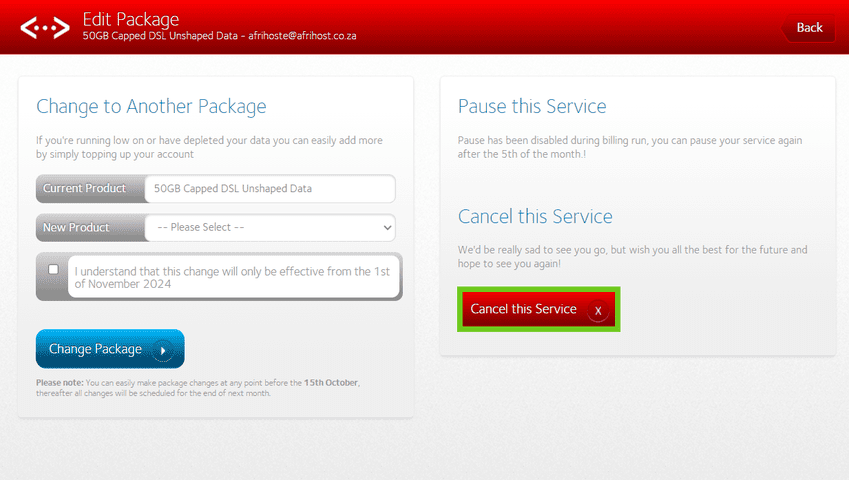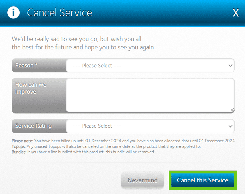 - Complete the cancellation form and click on ‘Cancel this Service’ again, to confirm your cancellation.