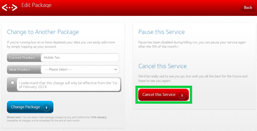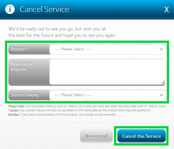 - In the ‘Cancel this Service section, complete the form and click on ‘Cancel this Service’ to confirm your cancellation.