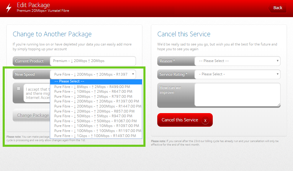 - Select the package you want to change to in the 'New Speed' dropdown under the 'Change to Another Package' section.