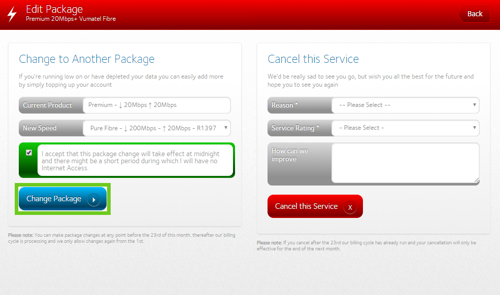 - Accept the terms and click on ‘Change Package’ to confirm your package change.