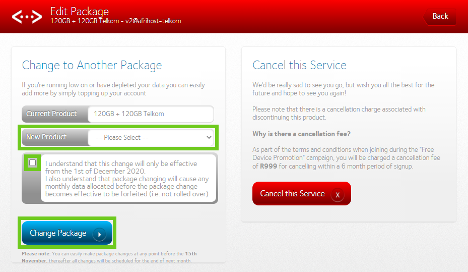 Select the package that you want to change to from the ‘New Product’ drop-down menu. - Accept the Terms by clicking on the checkbox and