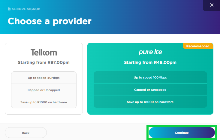 - If Pure LTE is available in your area, a choice of providers or just one, depending on coverage will appear.