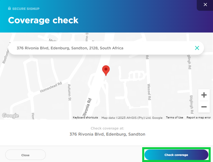 - A pop-up map will appear, confirm the location is correct and click on the ‘Check Coverage’ button.