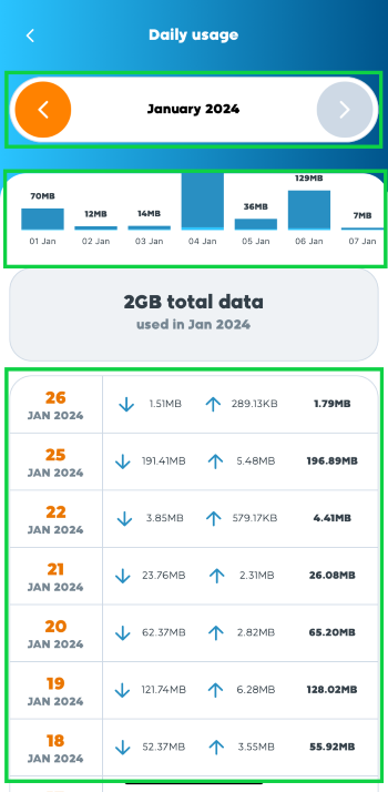 - For more detailed usage information, refer to the data usage table below displaying date, downloads, uploads, and total used data.