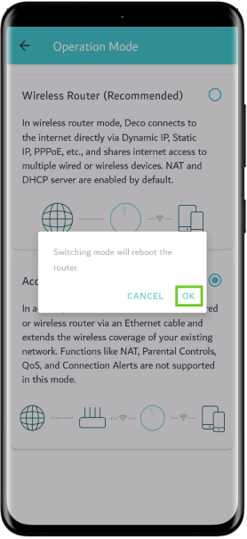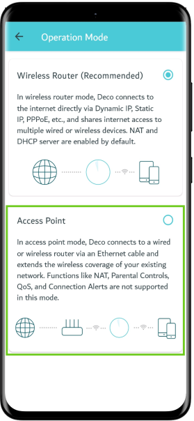 In ‘Access Point Mode’ DHCP functions are managed by the existing router and the Deco device aims to expand the existing network.