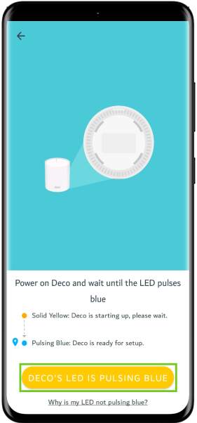 - ‘Power on Deco and wait until the LED pulses blue': Make sure that the Deco LED light is pulsing blue, which indicates that it is ready for setup.