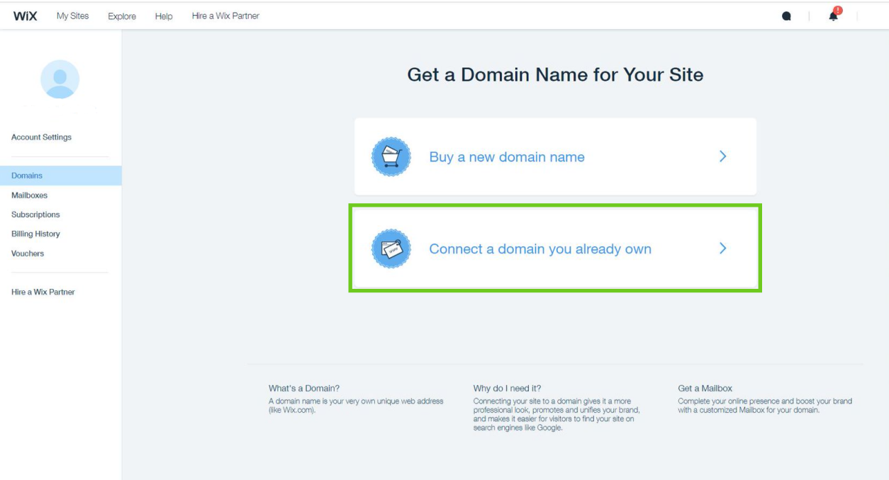 If you already have a domain in your account, click 'Add an Existing Domain', then select 'Connect a domain you already own'.