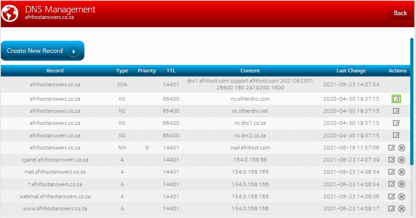 - Select the edit icon next to the ’www.yourdomainname.co.za’ A record.