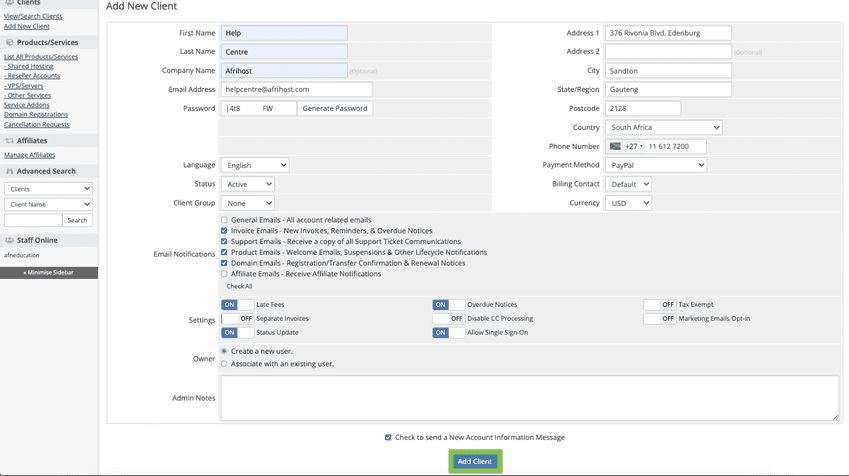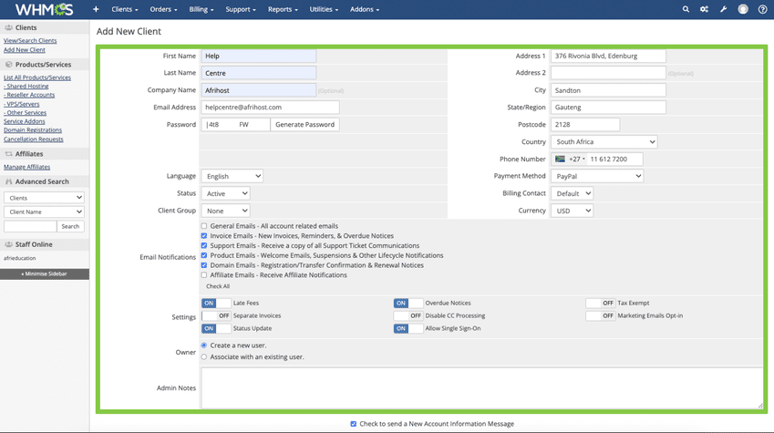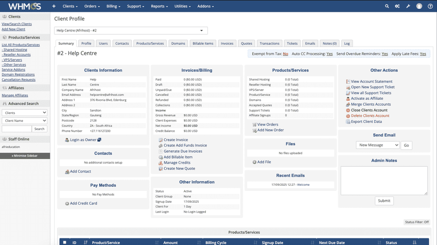 Creating a WHMCS client account profile allows you to store and manage all client details in one place. When setting up a profile you can assign specific roles, configure email notifications and categorize clients into different groups for easier management. Additionally, you can update or change client statuses to reflect actions taken on the profile, such as active, suspended or pending. This helps streamline client management and ensures that communication and services are properly tailored to each client’s account.
