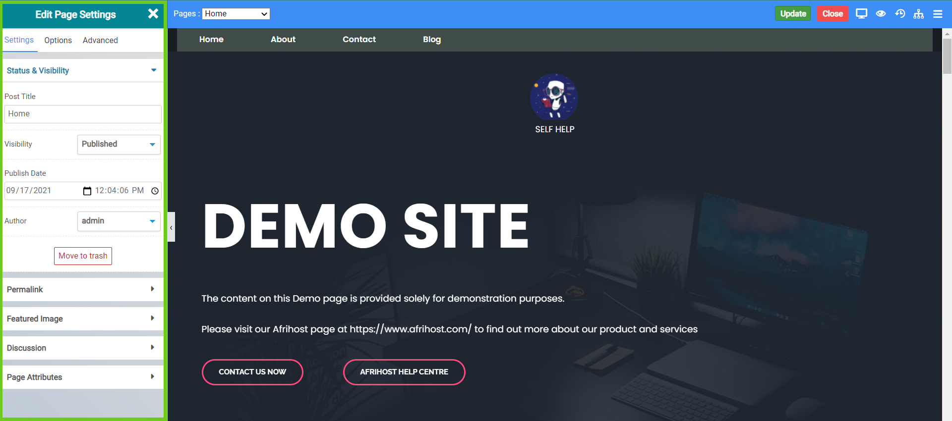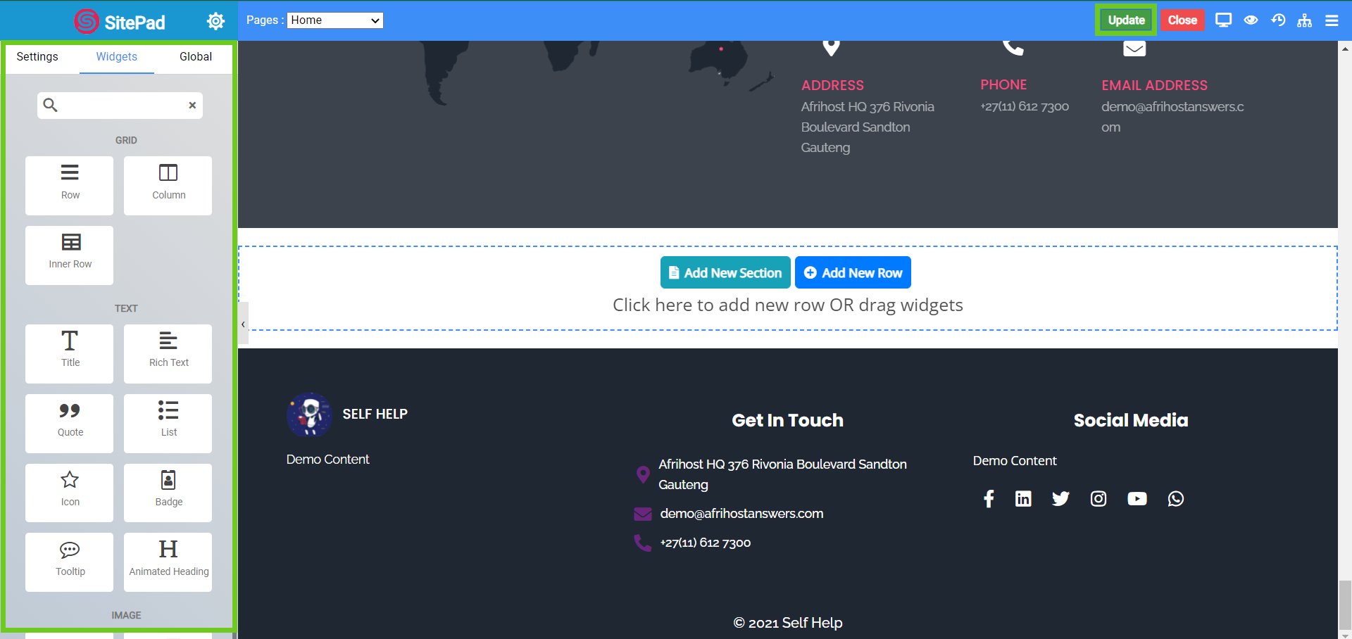 - Once completed, you can click on the ‘Update’ button to save and publish your work or select the ‘Close’ button to return to the SiteBuilder dashboard.