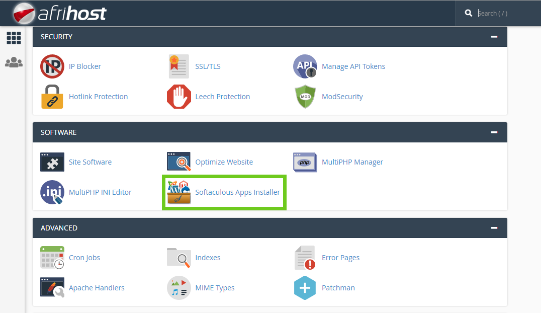 - Scroll down to the Software section of the page and select ‘Softaculous’.