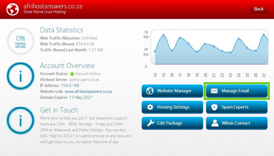 If you cannot find the 'manage email' button, it can mean that the domain is still new and the registration has not propagated yet or your domain is parked. Newly registered domains may take up to 72 hours to propagate. If you would like to upgrade the domain from parking to an email or hosting package, please read our Help Centre article for further information.