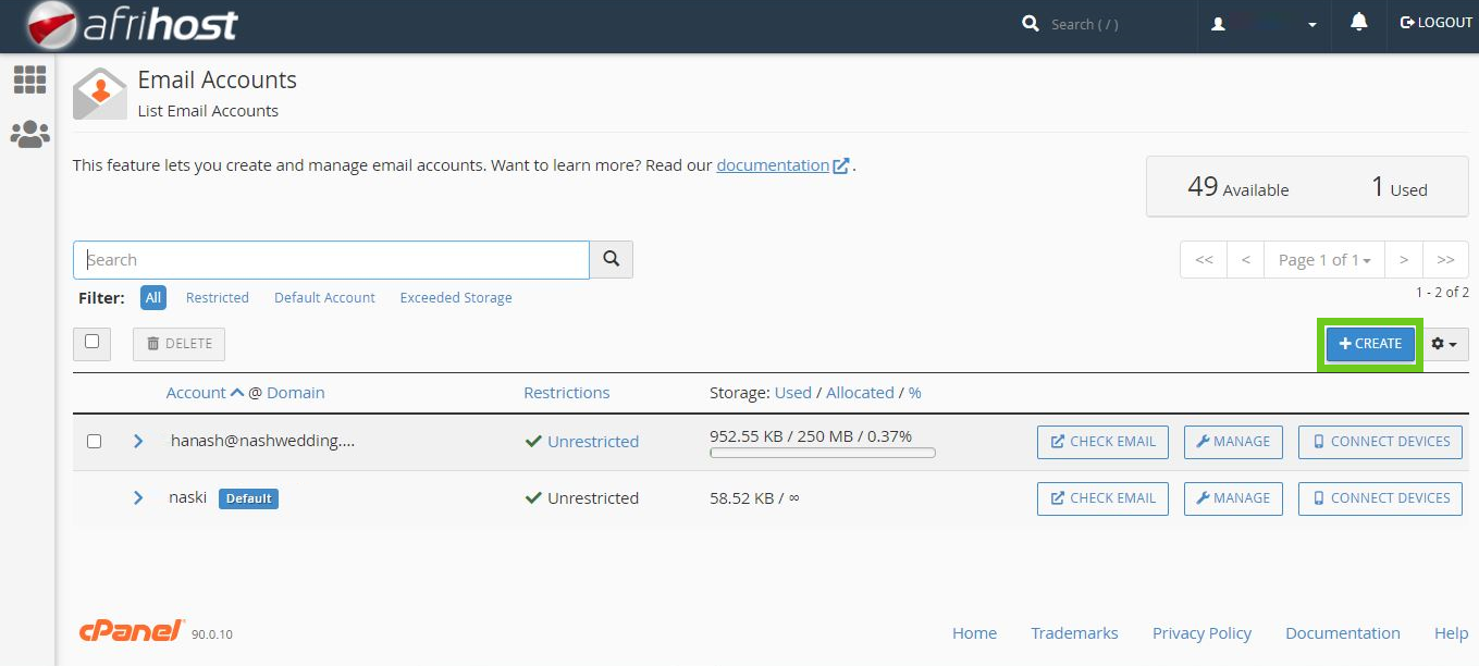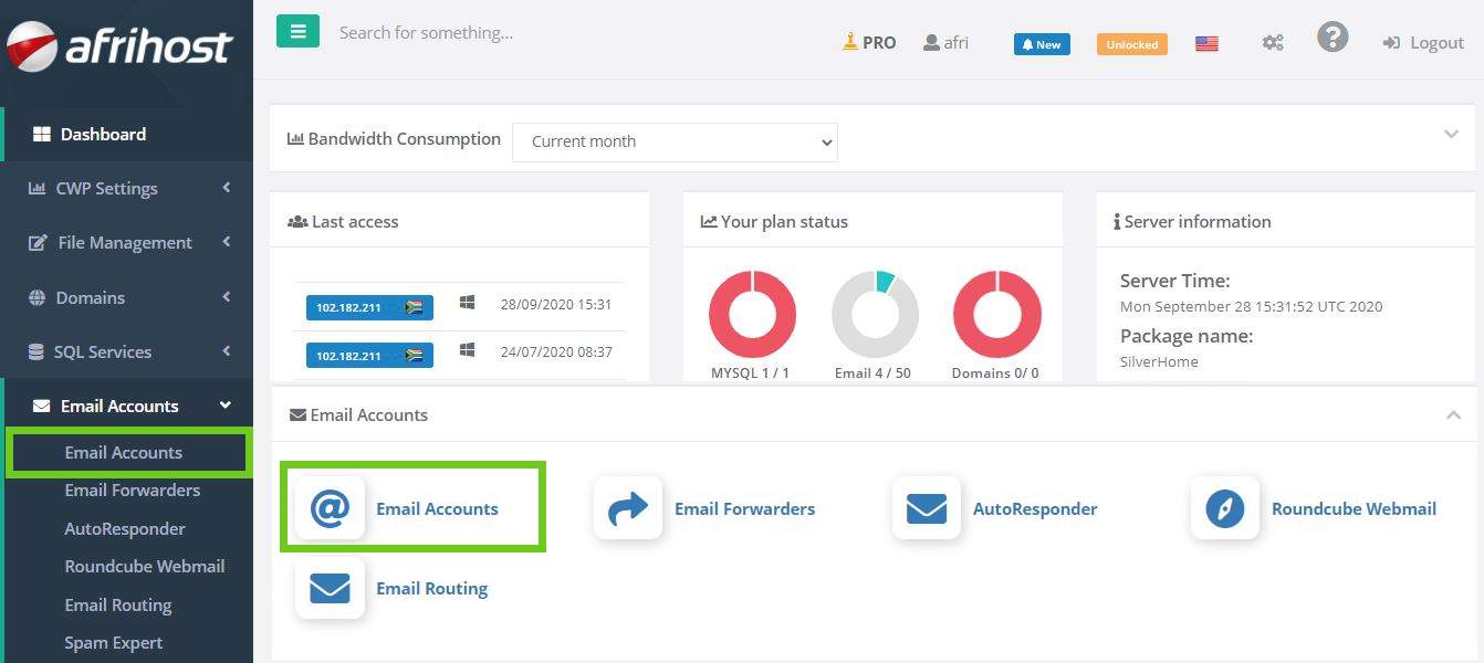 - Once in CWP, select ‘Email Accounts’, either from the menu on the left or scroll down the main menu options.