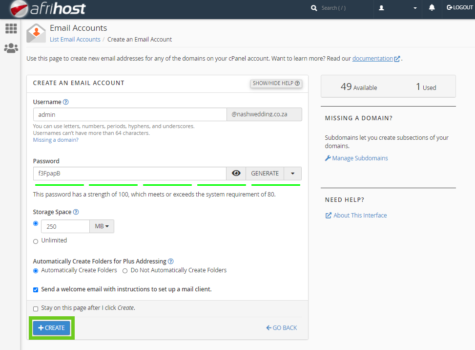 - Select the domain you wish to create a mailbox for from the list on the right-hand side.