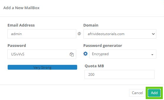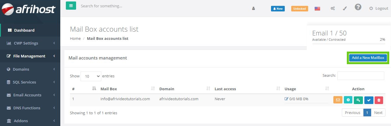 Your new mailbox will be created and will display in the Mail Box Account list.