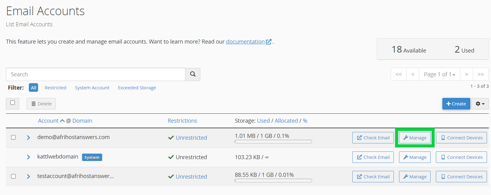 - Scroll down to find the email address you wish to delete and click on the ‘Manage’ button next to it.