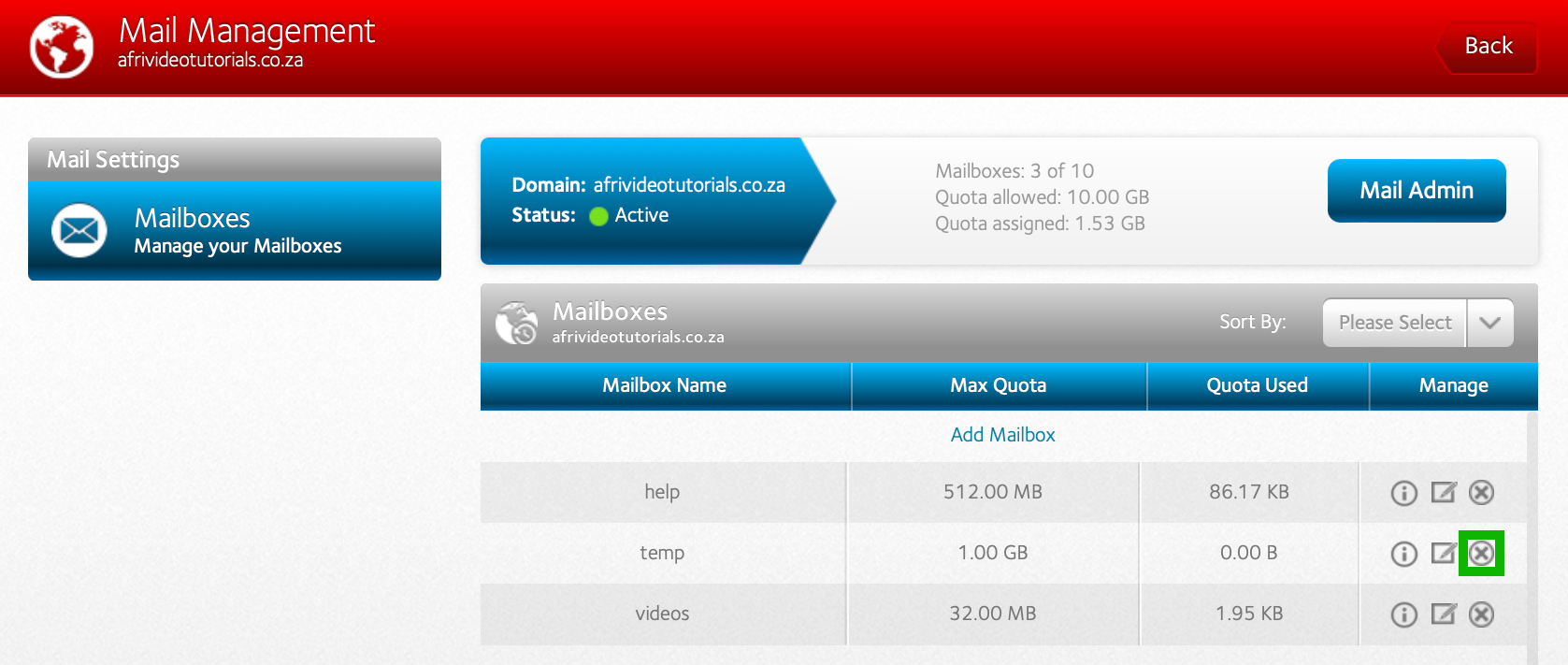 - Under the Mailboxes section, click the ‘X’ icon next to the email address you would like to delete.
