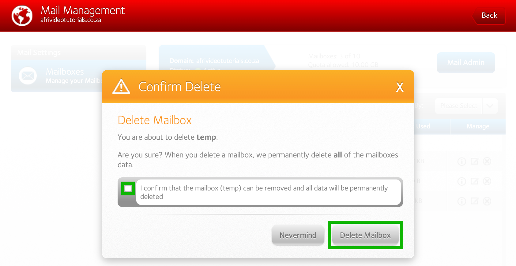 - If you are sure you want to delete your mails account, select the checkbox to confirm that you want to permanently delete this email account and click the ‘Delete Mailbox’ button.