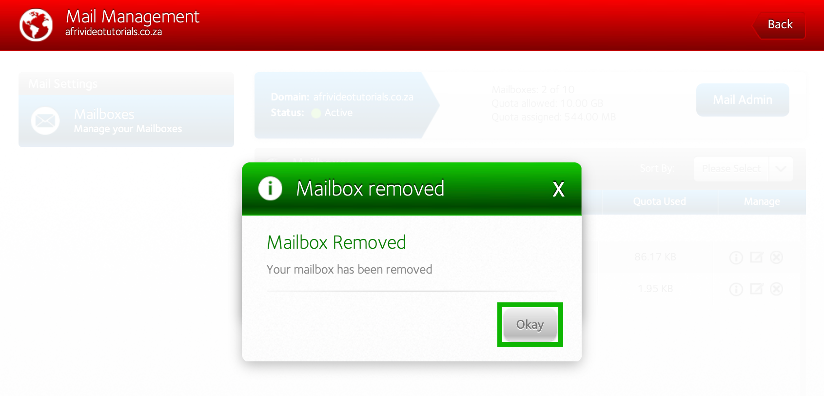 - A success message will pop up confirming that the mailbox was deleted successfully.