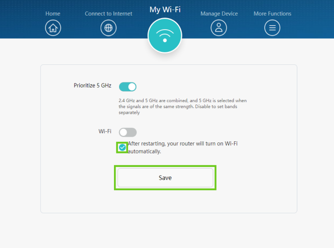 - On the next page, you will have the option to select ‘After restarting, your router will turn on Wi-Fi automatically'. This means that the next time you restart your router, the WiFi function will be enabled automatically.