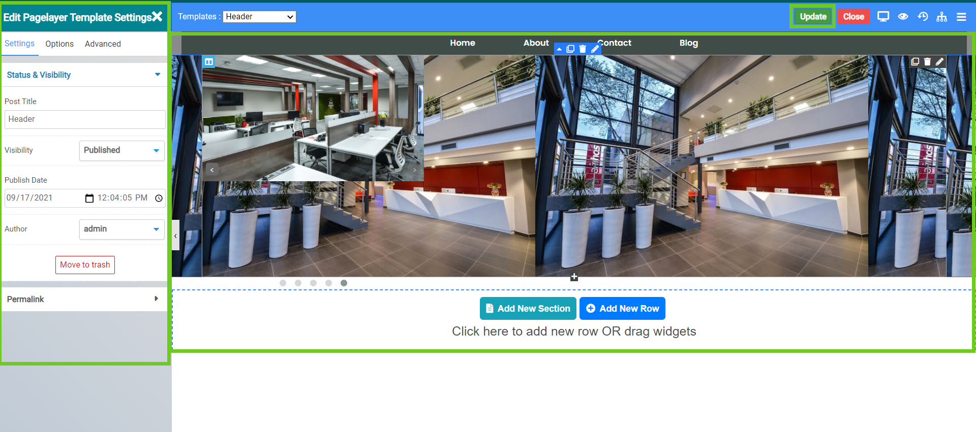 - You can add or update the page title, the page status, add widgets, sliders and backgrounds styles.