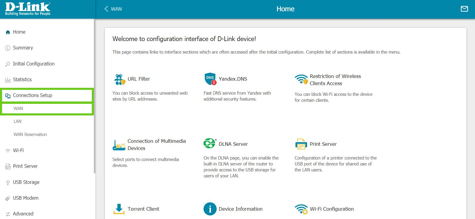 - This will open the router’s dashboard. Select ‘Connection Setup’ on the left and then select ‘WAN’ below that.