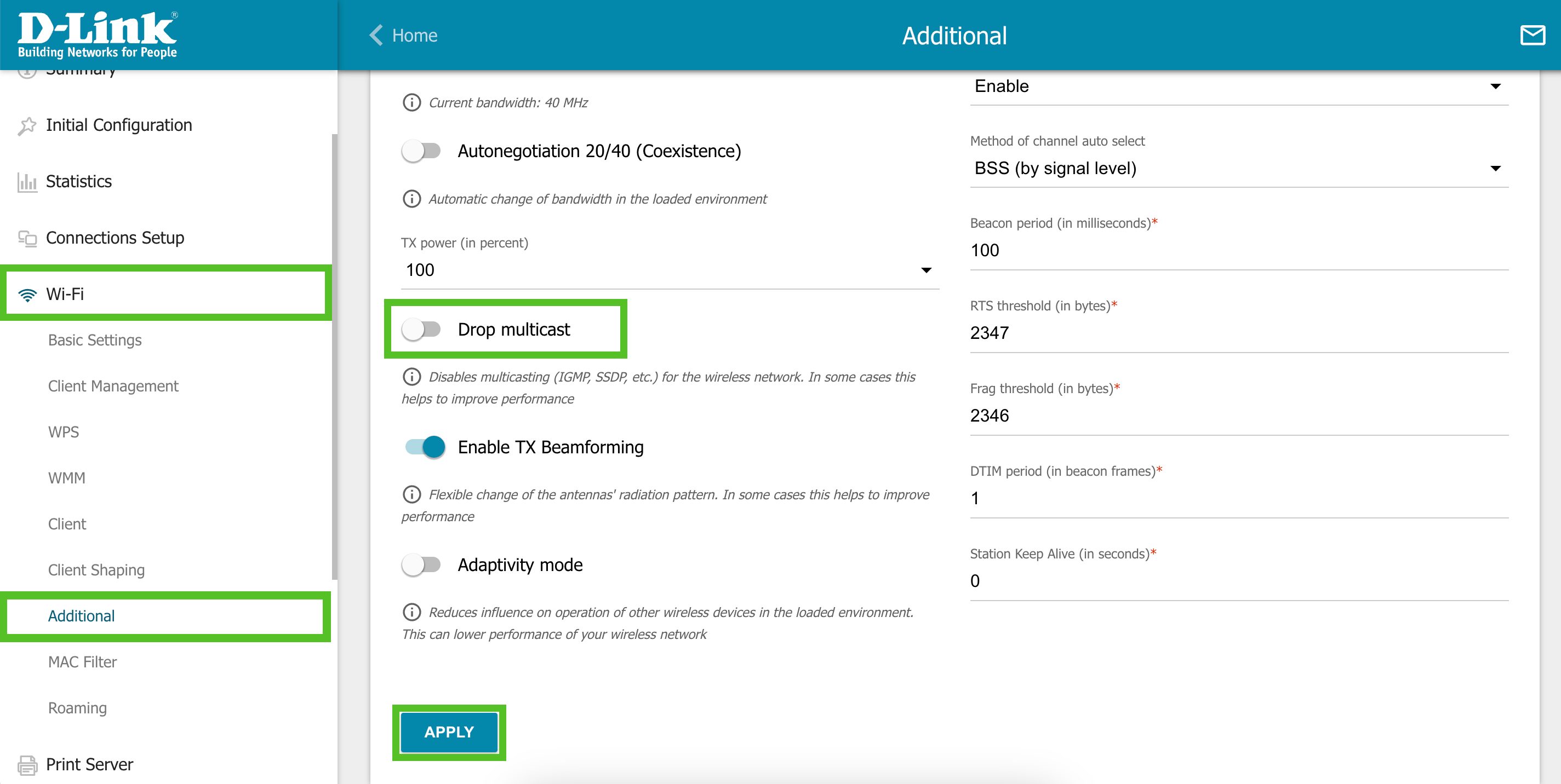 - Within the 2.4GHz additional settings, disable the 'Drop- multicast' toggle.