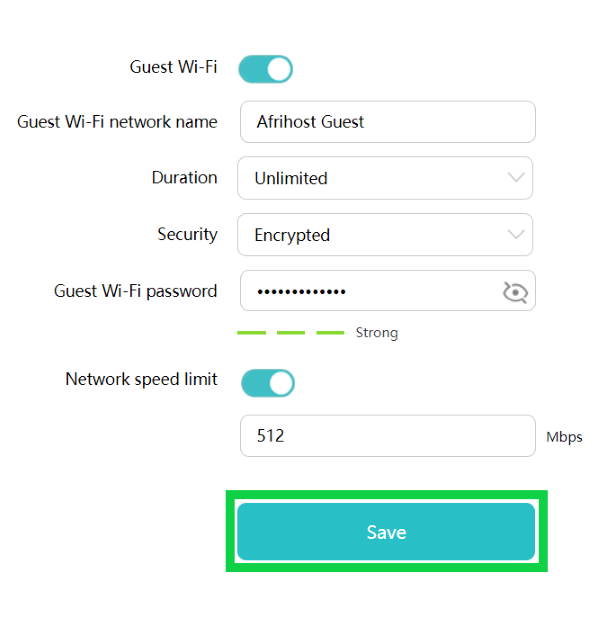 - Network speed limit: Enter the maximum speed or bandwidth allocated to the devices connected to the guest network.