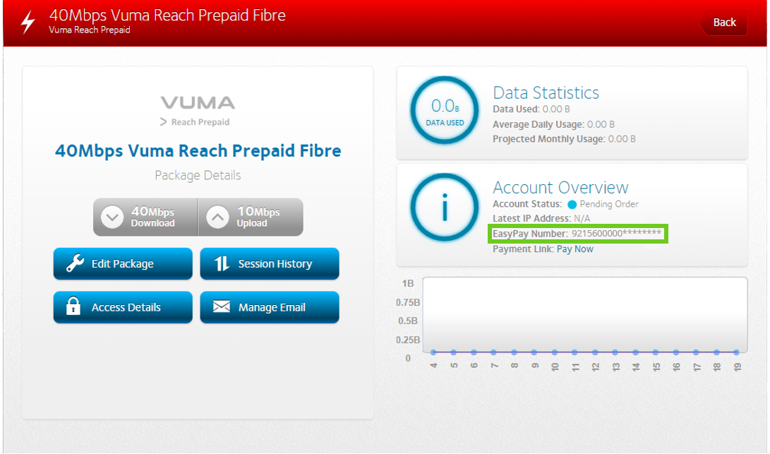 The amount you pay on EasyPay depends on the line speed that you have selected. If you are not sure, you can check your line speed in ClientZone under ‘Connectivity’, select your Vuma Reach Prepaid package and there you will see the line speed and amount to be paid.