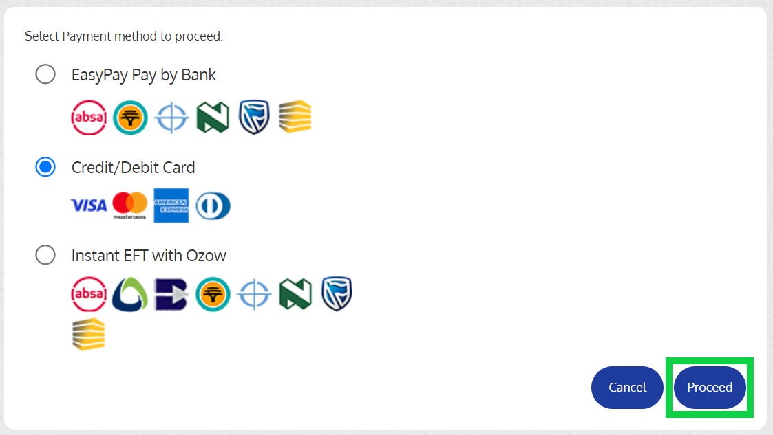 - Select the payment option you want to use and click the ‘Proceed’ button.