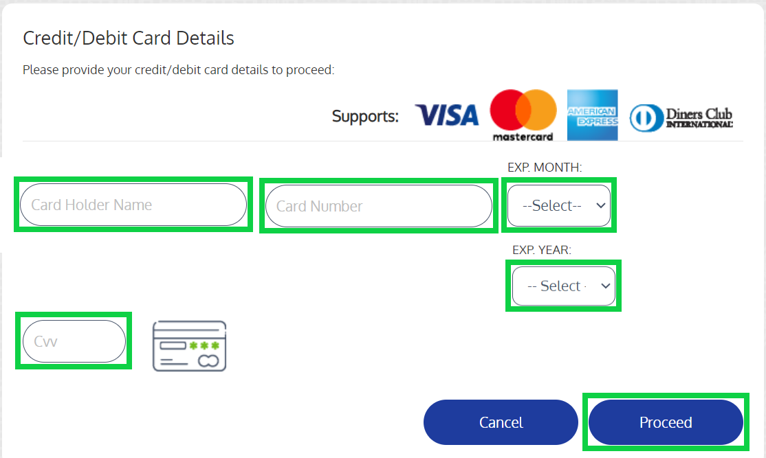 - Provide the required payment details for the payment option you selected and click ‘Proceed’.