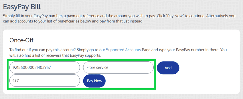 - Enter your EasyPay Number, Account Reference (eg: Fibre Service), and the amount that you are paying for the selected package.