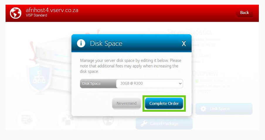 - Select ‘Complete Order’ to process the disk space upgrade.
